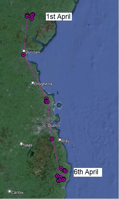 Red kite ‘9G’ (see here) has decided once again to leave Northern Ireland and has arrived back in south Wicklow. Many red kites are thinking about laying around this time so it’s looking like 9G wont be settling down any time soon!