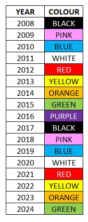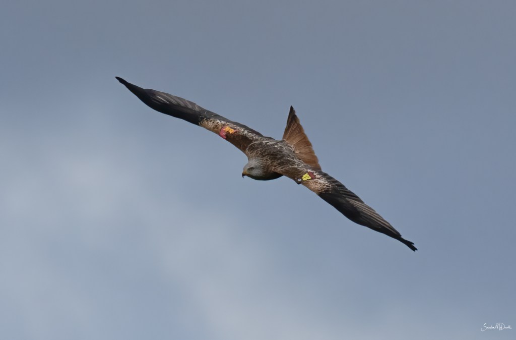 The colour and coding on the wing-tags represent the year and region the bird was born in. In Northern Ireland all the red kite wing-tags are brown on the left wing. The colour on the right denotes the year the bird was born.