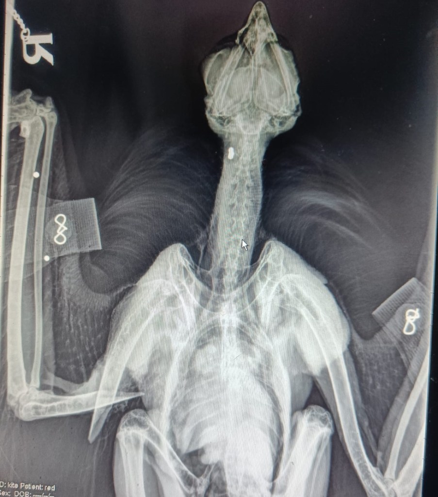 Shelagh’s husband Kenny runs Rathfriland Veterinary Clinic and was unfortunately called upon when Pink 6V was found injured. “Initially we could see that the red kite had a severely broken wing and the wound was already infected. The break was so bad that the agonising decision was made to put the bird to sleep.” Given that there was no logical explanation for the break, no wind turbine or overhead wires for example, an X-ray examination was carried out at the veterinary clinic. “It was then that we discovered she had been shot. There were gunshot pellets in her neck and wing. She will likely have broken her wing after a fall from height as a result from shooting”.