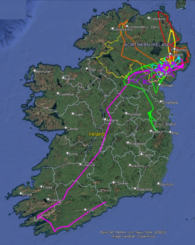 The dynamics (stability, growth or decline) of any population is based on the fundamentals of births, deaths, immigration and emigration. The red kite is a species which likes to breed close to other kites. They do not like to cross large bodies of water. The birds in the north west of the species’ European range tend not to migrate large distances. Therefore we can assume that immigration and emigration from localised populations occurs almost exclusively within the island of Ireland. In fact we know that some NI released / born birds are now breeding in ROI and vice versa, but these are in the single figures. Is there a greater linkage between the population in Northern Ireland and that in Co. Wicklow and north Dublin than we currently understand? Where will these young birds spend their first winter? Will they explore or remain settled?